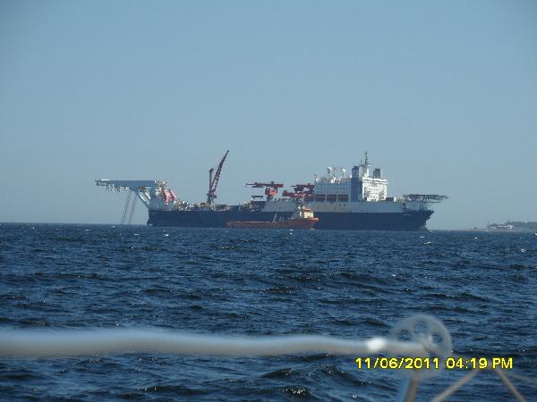Suursaaren pohjoisosassa oli erikoisen näköinen alus. Liittyneekö kaapelin vetoon tai kaasuputkiin, en tiedä.
