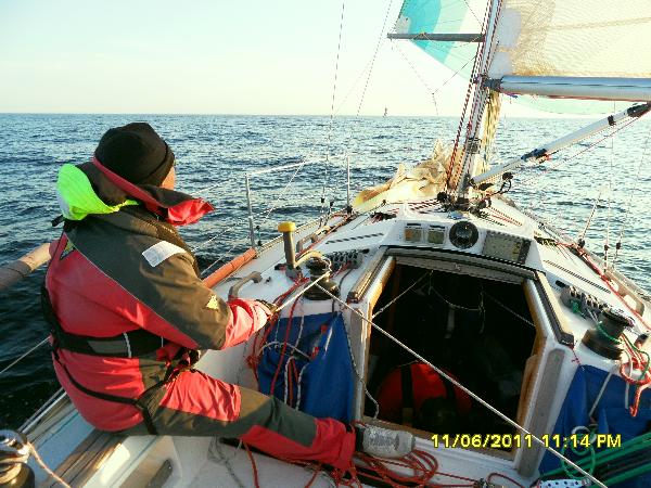 Makoilin sitten punkassani ja kuuntelin pohdiskeluja eteläkärjen katveesta, joka onnistuttiin välttämään. Spinnu oli nostettu jo ennen eteläkärkeä. Seuraavaksi kuuntelin keskustelua vuoripuuskista ja spinnun ajamisesta sivutuulessa 14 m/s puuskissa. Eivät broatchanneet kertaakaan, mutta kuulin Jounin raportoivan, että spinnu on revennyt. Nopeutta oli 2 solmua yli runkonopeuden sileässä vedessä. Unet jäivät taas näkemättä. Ojensin heavy spinnun vaihtoon ja aloitin spinnun teippauksen.