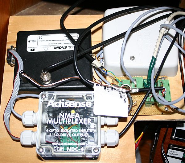 ActisenseltäMultiplexeri, AIS vastaanotin ja TackTickin NMEA Interface ruuvattiin vanerilevylle. Jotta levyn voi viedä helposti pois veneestä, lisättiin verolevyn pätkä, jolle sai kytkettyä liittimet kutakin laitetta varten.