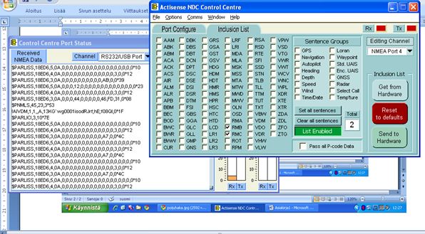 Boxissa on NMEA sisäänmenot 0, 1, 2, 3 ja 4. Ulostuloja on 0 ja 1. PC liitäntää varten ovat portit 0. Sisään ja ulos. Pitää valita käyttääkö 0 porttia USB:lle vai RS232:lle. USB toimii PC:n kanssa paremmin joten sitä käytetään.
