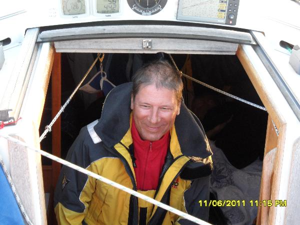 Myötäinen tuuli parani mukavasti johonkin 15 m/s saakka. Reivatulla isolla ja spiiratulla genoan kulmalla matka jatkui yöllä. Tuuliperäsin ohjasi, mutta jouduttiin väistämään muutamaa laivaa ja venettä. Myötäaallossa iso meni välillä pakkiin, jota tuuliperäsin ei osaa ilman apua hoitaa. Jossain vaiheessa koitti avomeripurjehduksen huippuhetki: Kun pääsee nukkumaan.