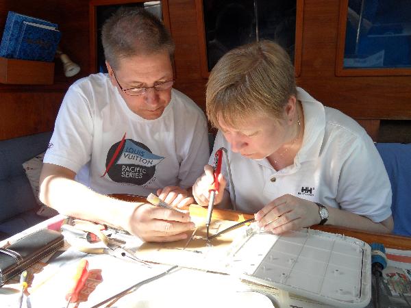 Helinä johtui siitä, että antennin elementit olivat irronneet. Eristimien liimat eivät olleet kestäneet maailmankierron rasituksia. Liimasimme elementit paikalleen, mutta vika ei ollut pelkästään siinä. Koaxiaalikaapeli oli myös vioittunut. Juotimme uuden kaapelin paikalleen ja teippasimme kotelon kiinni.
