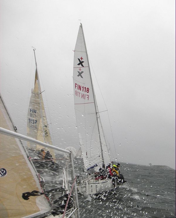 Kauden päätöskisa karvalakki sai taas perinteisen sään. Kovaa tuulta ja tihkusadetta. Meillä oli kevyt miehistö, joten lähdimme reivatulla isolla ja fokalla liikkeelle. Valinta oli ilmeisesti oikea, koska täydellä isolla lähteneet LOW ja Donna eivät saavuttaneet meitä startin jälkeen. Startissa X-tas lähti kärkeen ja meidän piti ohitella edelle päässeitä veneitä.